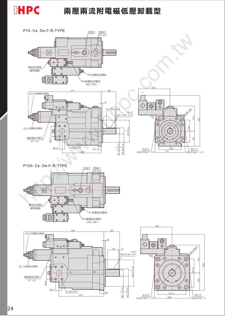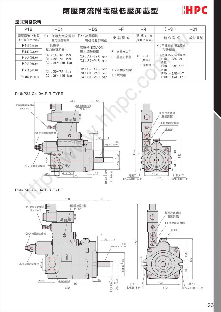 P16-C1-D3-F-R-01 C-D_Type產(chǎn)品特色說明 兩壓兩流的控制功能,系統(tǒng)壓力超過PL的壓力設(shè)定值以上時(shí),泵浦自動轉(zhuǎn)變?yōu)镼L值的小流量。 高壓測PH的壓力是由泵浦上安裝的電磁方向閥的換向,來轉(zhuǎn)變低壓卸載或是...
