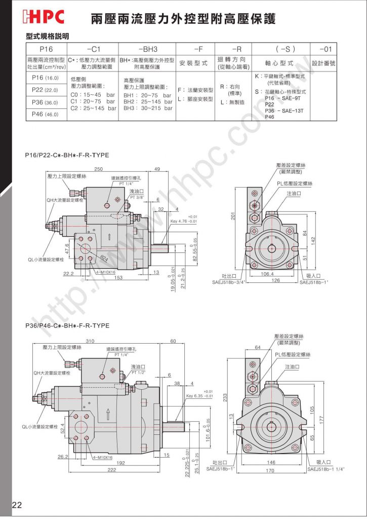 P16-C1-BH3-F-R-01 C-BH_Type產品特色說明 兩壓兩流的控制功能,系統壓力超過PL的壓力設定值以上時,泵浦自動轉變為QL值的小流量。 高壓測PH的壓力設定是受外部遙控引導閥的壓力所控制,但是油泵有可調...