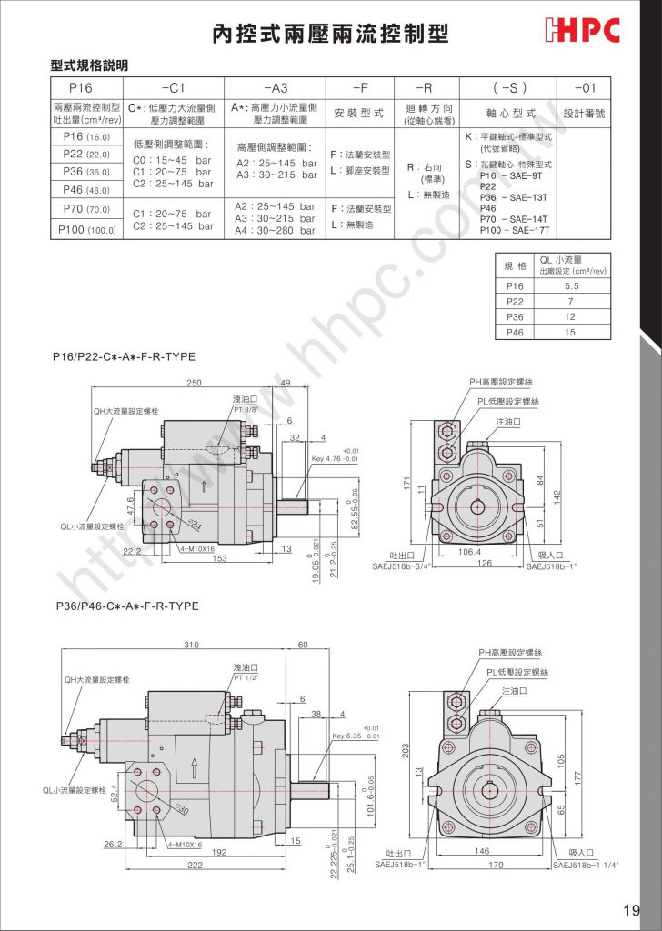 P16-C1-A3-F-R-01內控式兩壓兩流控制型 C-A_Type產品特色說明 泵浦在低壓時為大流量,高壓力時為小流量的兩壓兩流控制功能。 當系統壓力負荷增高,超過PL的壓力設定值以上時,泵浦自動轉變為QL值的小流...